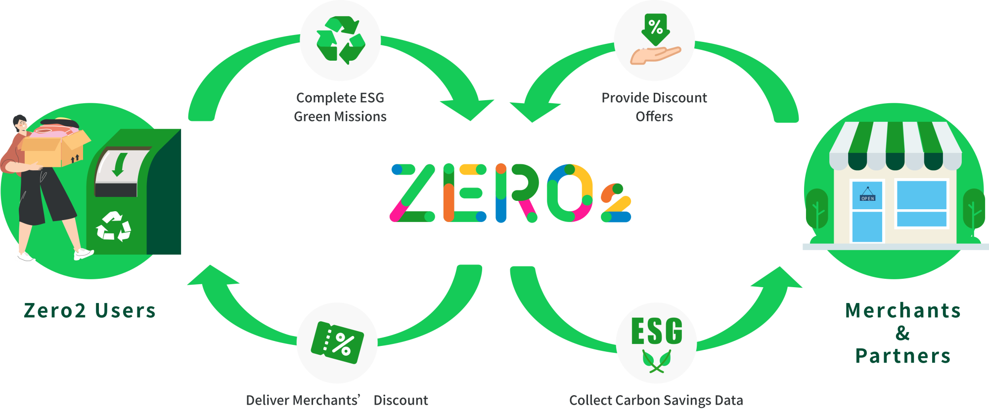 - By digitizing and aligning ESG initiatives with daily sustainable living actions, Zero2 aspires to cultivate a sustainable ecosystem by incentivizing individuals through a merchant loyalty program geared towards a net-zero future.